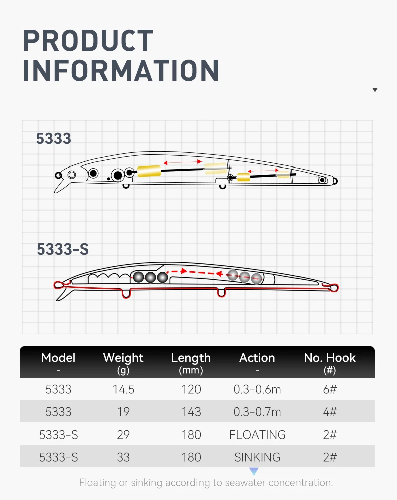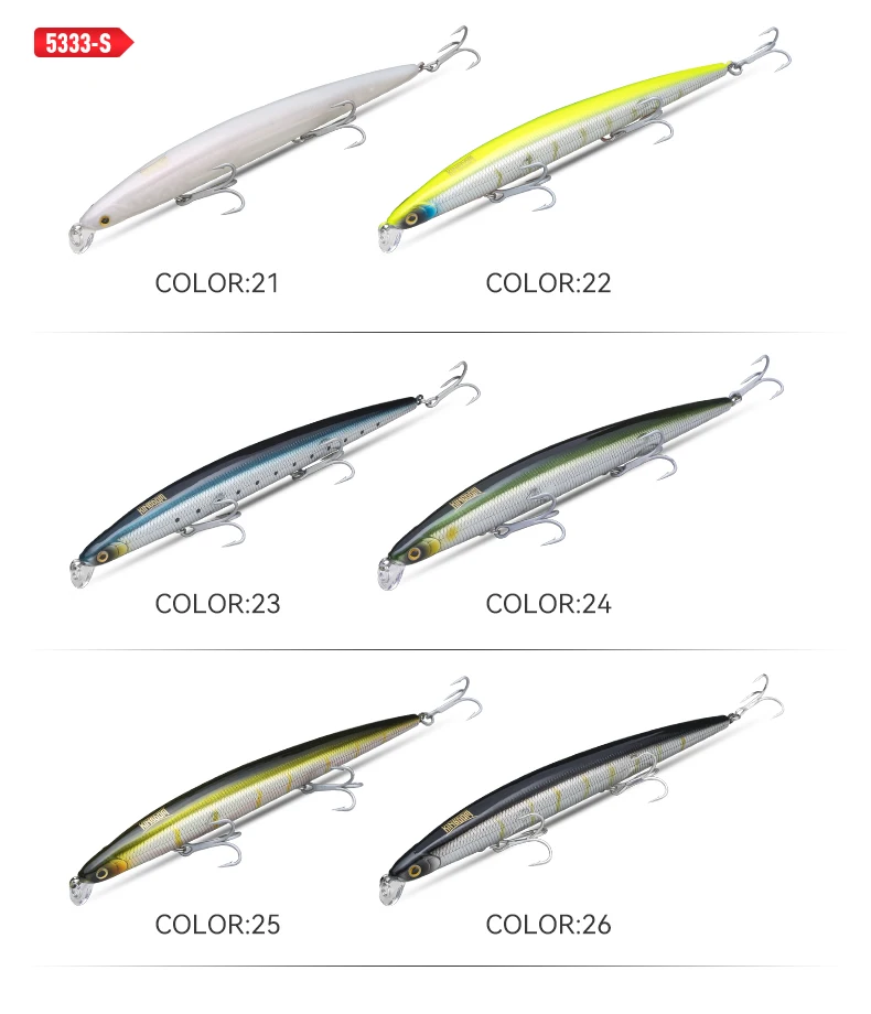 El diseño realista de su señuelo duro define el señuelo de pesca KINGDOM de lance largo, flotante, de hundimiento lento, de 14,5 g, 19 g y 29 g, ideal para lubina y lucio. Fabricado en plástico ABS resistente, este señuelo tipo minnow presenta una estructura de alambre resistente de un solo paso. Por lo tanto, su diseño realista de su señuelo duro resiste la presión de las batallas de pesca de lubina y lucio. El modelo 5333S refleja la ingeniería de calidad de China continental. Además, cada unidad no contiene componentes químicos ni electrónicos de alta calidad. Gracias a su diseño realista de su señuelo duro que imita el cebo vivo, los depredadores atacan con confianza en la pesca en rocas oceánicas y en estanques.