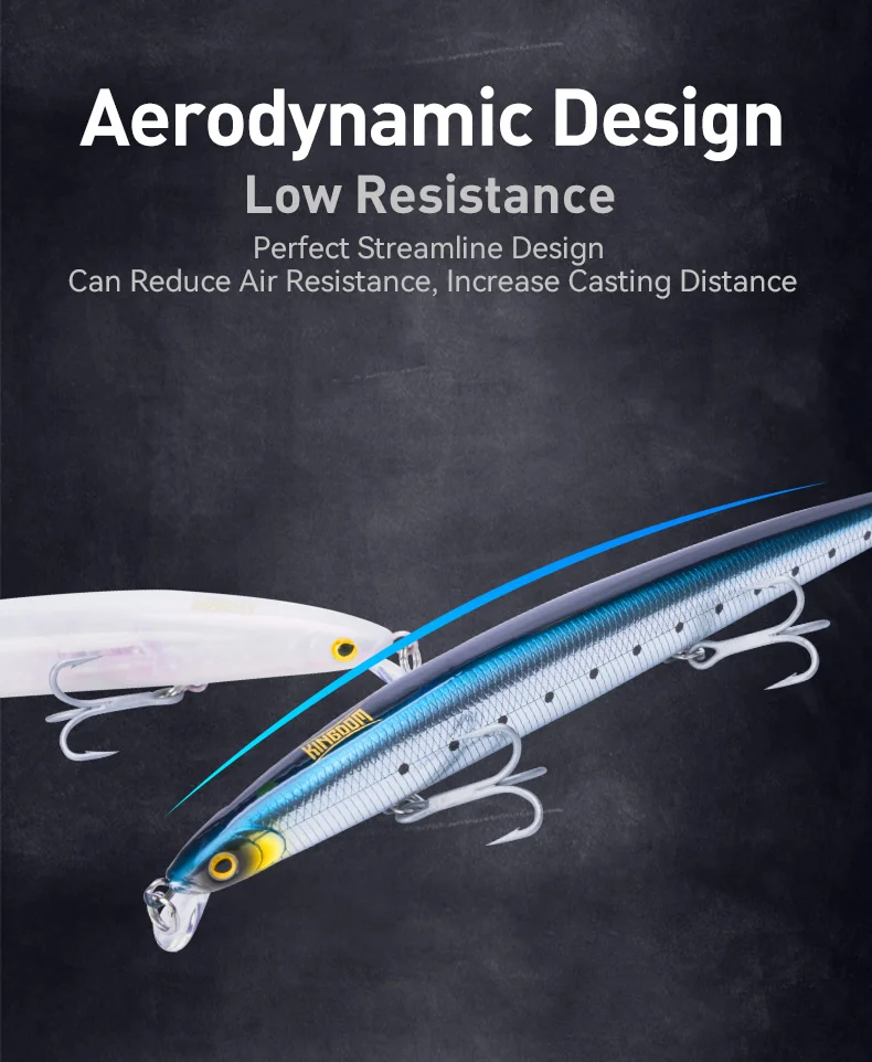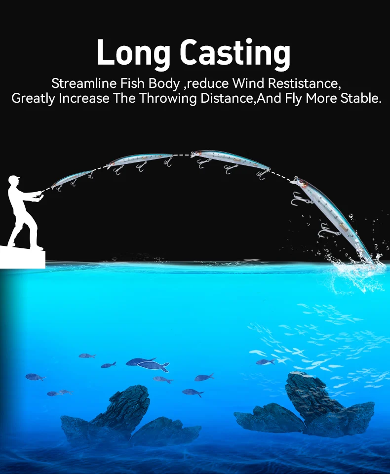 La mayor distancia de lance define al señuelo de pesca KINGDOM de largo alcance, flotante, de hundimiento lento, Minnow, 14,5 g, 19 g y 29 g, Wobbler artificial duro para lubina, lucio. Gracias a su cuerpo aerodinámico y su sistema de alambre de un solo paso, corta el viento con suavidad. Como resultado, los pescadores obtienen una mayor distancia de lance desde la orilla, zonas de pesca en rocas oceánicas y orillas de estanques. Además, la pesca en barco y en la playa exige alcance, y este señuelo KINGDOM de largo alcance lo ofrece de forma constante. Gracias a su diseño, que facilita el control del minnow artificial duro, se cubre más agua rápidamente. En consecuencia, se mejoran las tasas de picadura en lagos, ríos, arroyos y zonas costeras.